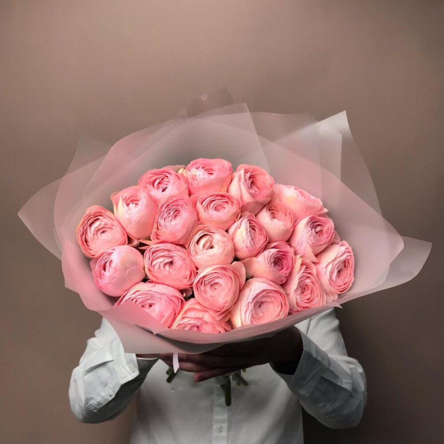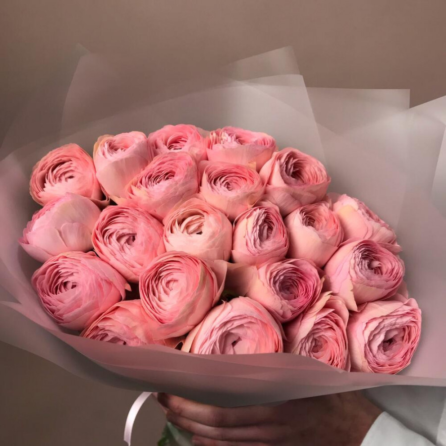 На фото букет: 21 розовый ранункулюс. В составе: ранункулюс 21 шт, дизайнерская упаковка 1 шт, атласная лента 1 шт, . Все цветы свежие и ароматные, букет красиво оформлен и отлично подходит для подарка. Доступна доставка цветов или самовывоз.