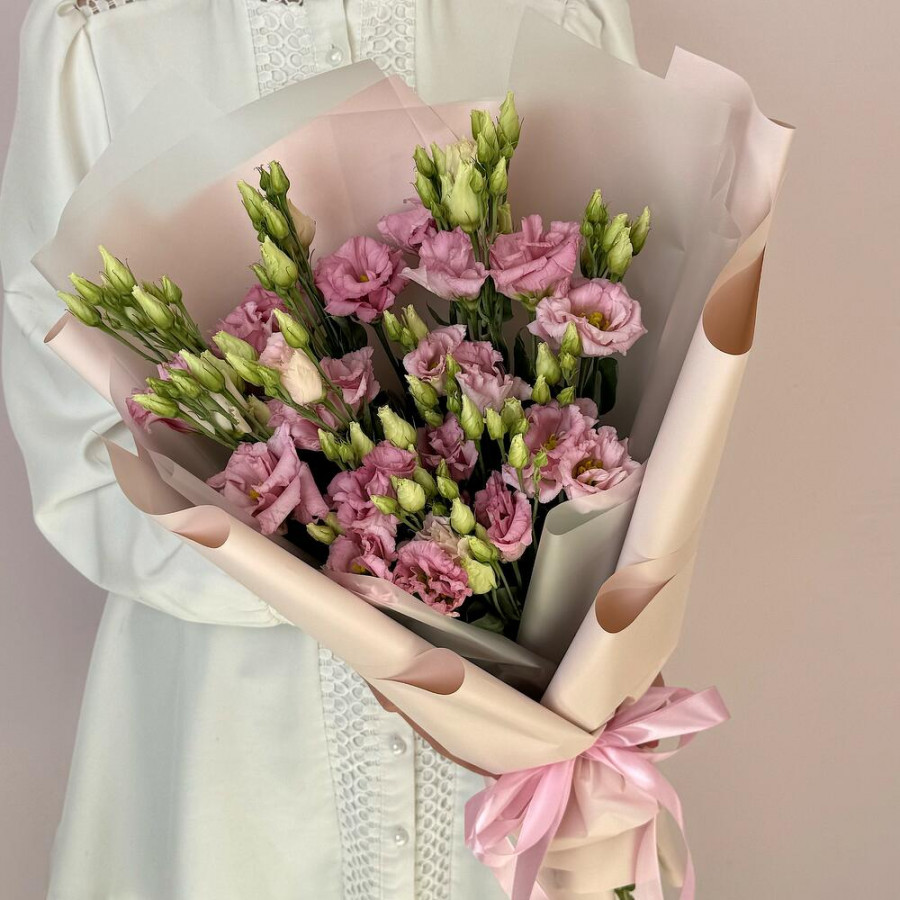 На фото букет 5 розовых эустом. В составе: эустома (лизиантус) 5 шт, дизайнерская упаковка 1 шт, атласная лента 2 шт, . Все цветы свежие и ароматные, букет красиво оформлен и отлично подходит для подарка. Доступна доставка цветов или самовывоз.