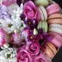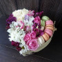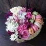На фото большая коробка с макарунами и цветами. В составе: макаруны 8 шт, роза 7 шт, хризантема кустовая 4 шт, альстромерия 3 шт, коробка (m) 1 шт, . Все цветы свежие и ароматные, букет красиво оформлен и отлично подходит для подарка. Доступна доставка цветов или самовывоз.