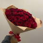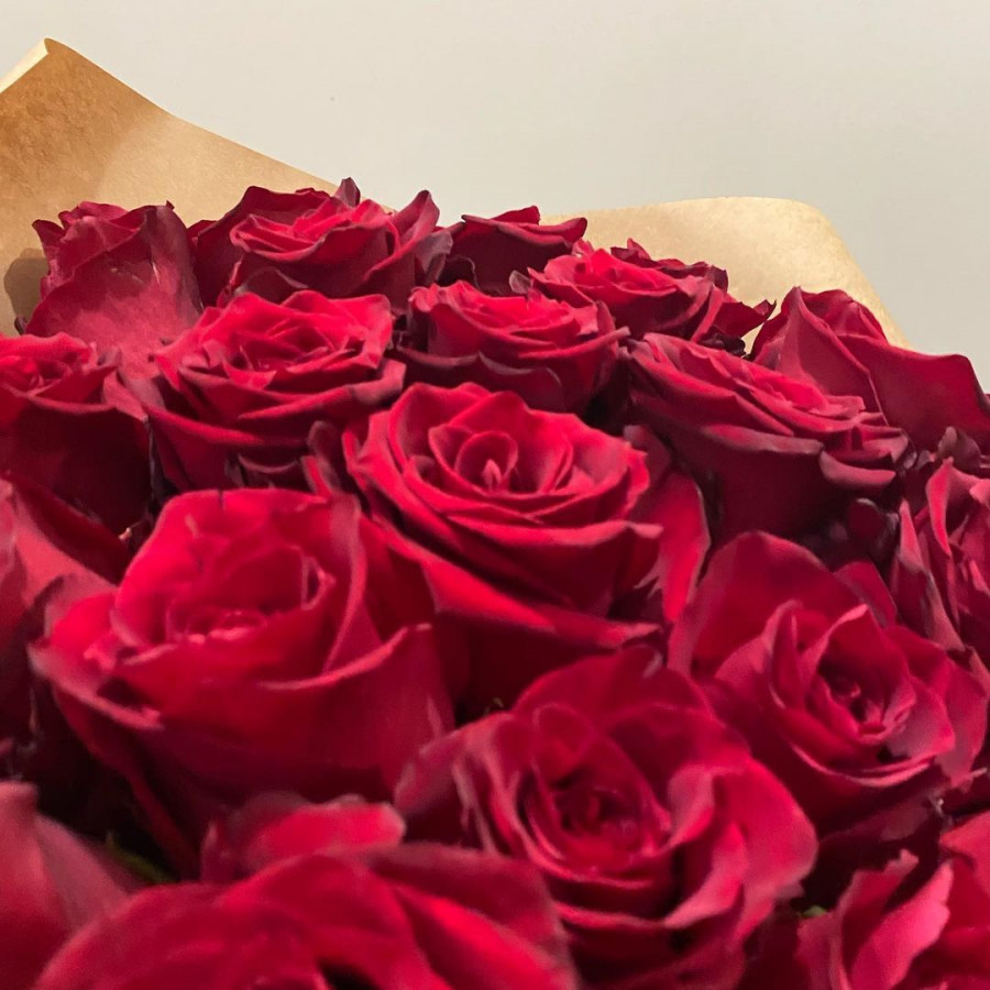 На фото букет из 23 красных роз. В составе: роза 23 шт, крафт-бумага 1 шт, атласная лента 1 шт, . Все цветы свежие и ароматные, букет красиво оформлен и отлично подходит для подарка. Доступна доставка цветов или самовывоз.