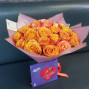 На фото букет из 27 желтых роз. В составе: роза 27 шт, крафт-бумага 1 шт, атласная лента 1 шт, . Все цветы свежие и ароматные, букет красиво оформлен и отлично подходит для подарка. Доступна доставка цветов или самовывоз.