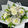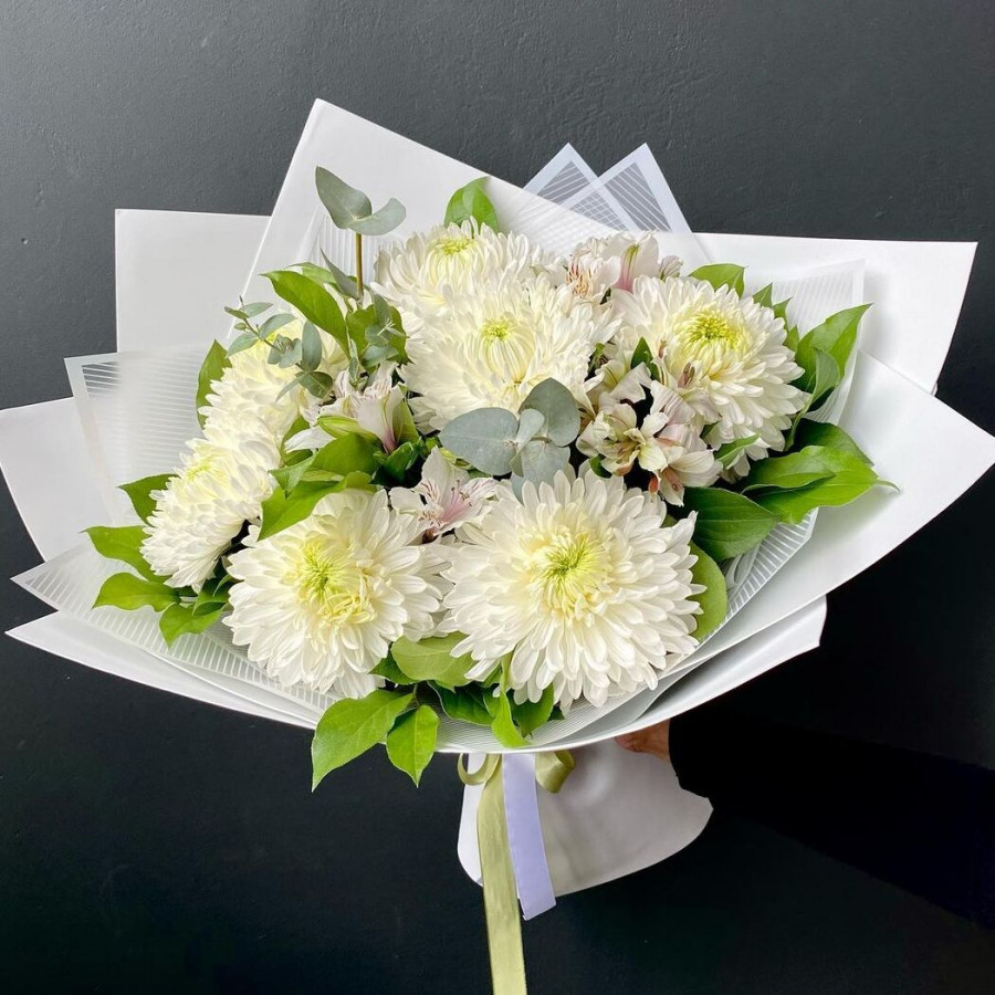 На фото букет из белых одноголовых хризантем и эвкалипта. В составе: хризантема одноголовая 7 шт, альстромерия 2 шт, эвкалипт 3 шт, крафт-бумага 1 шт, атласная лента 1 шт, . Все цветы свежие и ароматные, букет красиво оформлен и отлично подходит для подарка. Доступна доставка цветов или самовывоз.