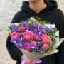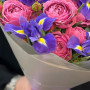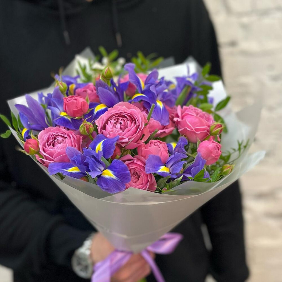 Букет из розовых пионовидных роз и синих ирисов в Качканаре