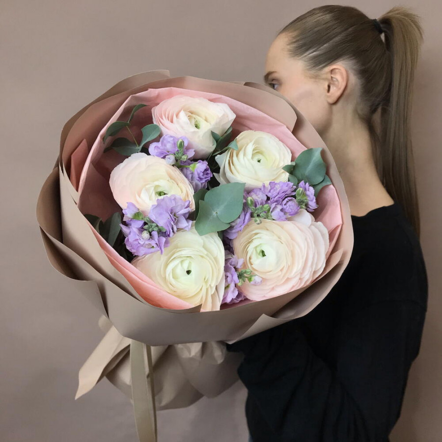 Букет из розовых ранункулюсов и сиреневой матиолы в Качканаре
