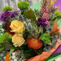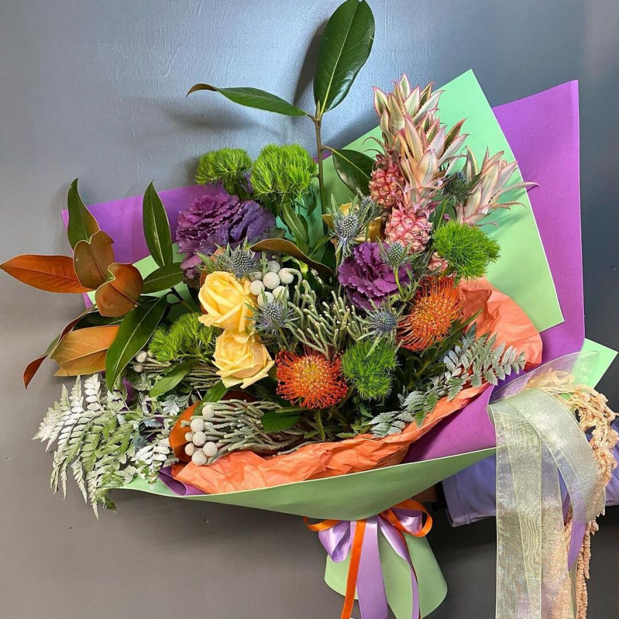 На фото экзотический букет с ананасом. В составе: ананас декоративный 1 шт, капуста декоративная 3 шт, леукоспермум 3 шт, эрингиум 2 шт, диантус 3 шт, роза 3 шт, бруния 3 шт, папоротник 2 шт, . Все цветы свежие и ароматные, букет красиво оформлен и отлично подходит для подарка. Доступна доставка цветов или самовывоз.