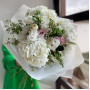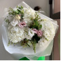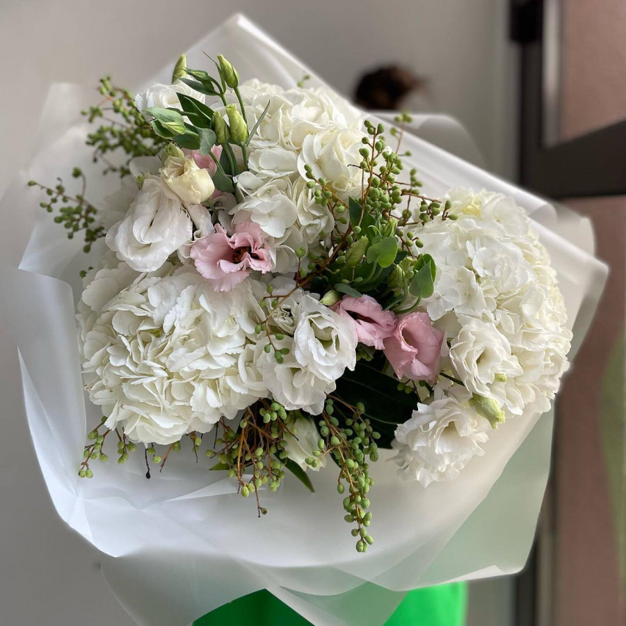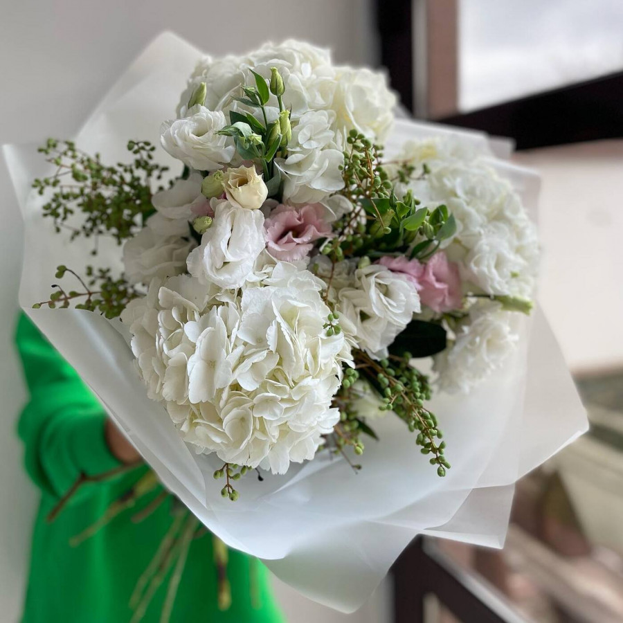 На фото свадебный букет с белой гортензией. В составе: гортензия 3 шт, эустома (лизиантус) 4 шт, лигуструм 3 шт, эвкалипт 2 шт, крафт-бумага 1 шт, . Все цветы свежие и ароматные, букет красиво оформлен и отлично подходит для подарка. Доступна доставка цветов или самовывоз.