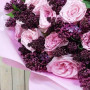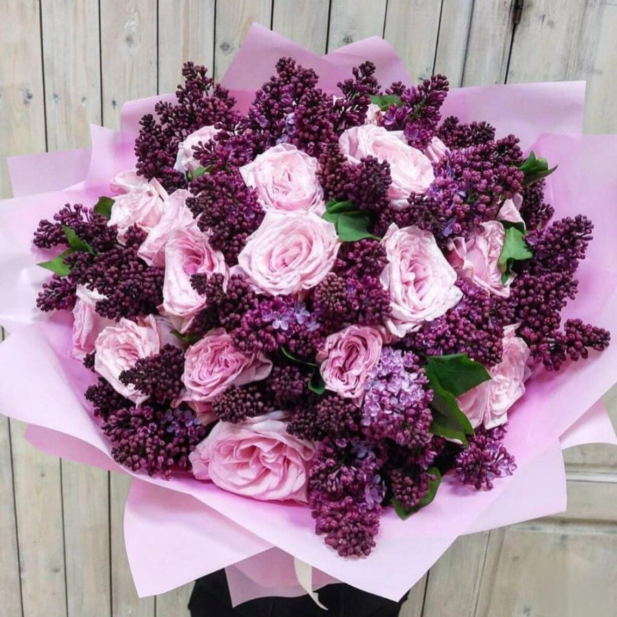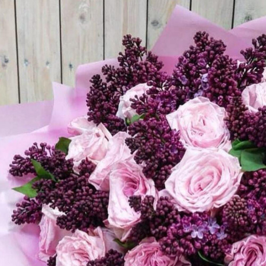 Сирень - 13 шт. Роза - 15 шт. Упаковка - 1 шт. Лента атласная - 1 шт. Открыточка с вашими пожеланиями - 1 шт. отличное настроение - 1000 шт.